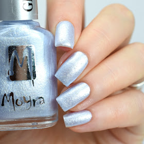 999 VALERIE - jäänsininen metallinen shimmerlakka, jossa seassa sähkönsinistä sekä hopeaa shimmeriä ja glittereitä. Glittereiden takia pinta näyttää vähän rosoiselta, mutta glitterit tuntui vain vähän. Yhdellä päällyslakka kerroksella pinta tasoittuu. Swatchissa 3 kerrosta, ei päällyslakkaa.